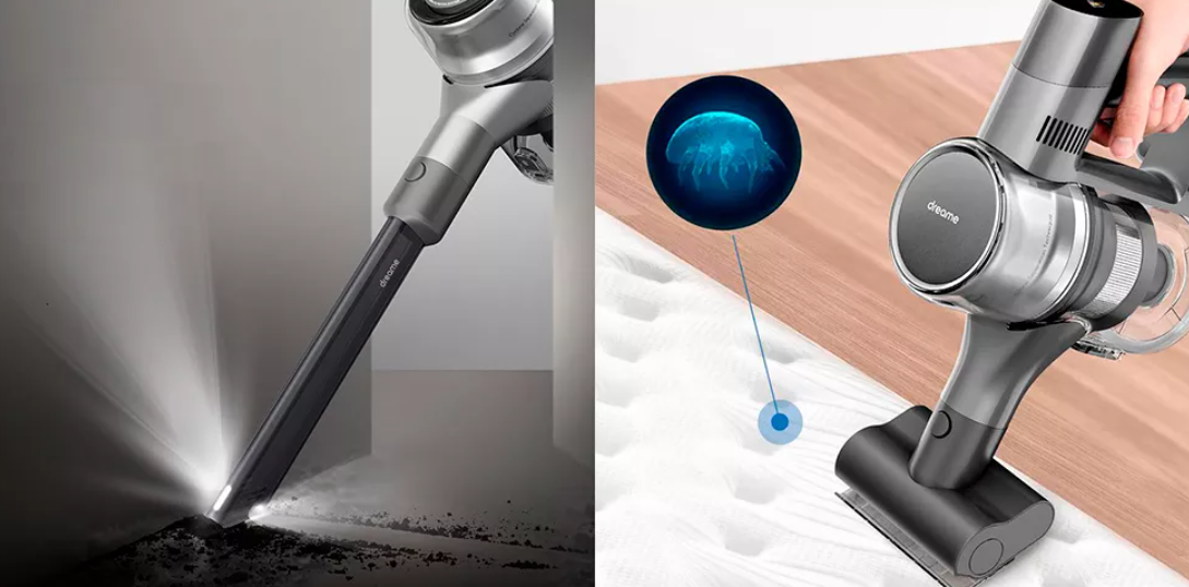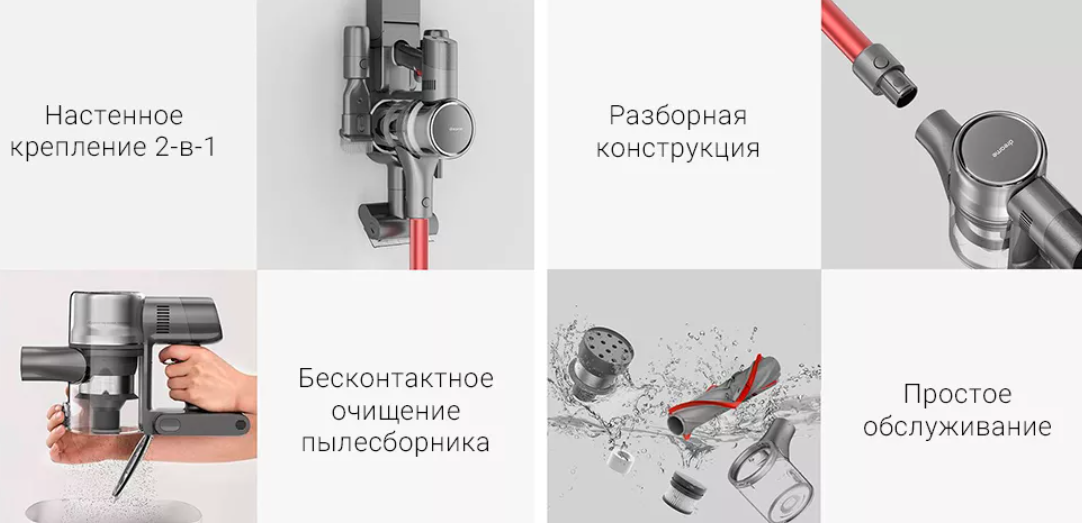 Dreame V12 оснащен настенным держателем 2-в-1, который предназначен для хранения и зарядки устройства. Очистка пылесборника осуществляется бесконтактно, нажатием одной кнопки. Конструкция пылесоса легко разбирается, а его фильтры и щетки можно помыть самостоятельно обычной водой.