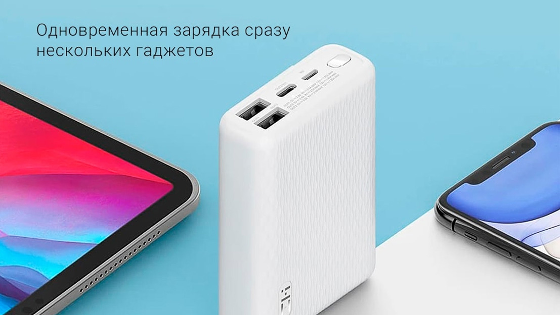 Порты USB-A и USB-С обеспечивают максимальную суммарную мощность до 22,5 Вт. Также устройство поддерживает быструю зарядку (QC 2.0, QC 3.0) и протокол Power Delivery (PD). В комплекте с устройством поставляется кабель USB Type-A на Type-C.