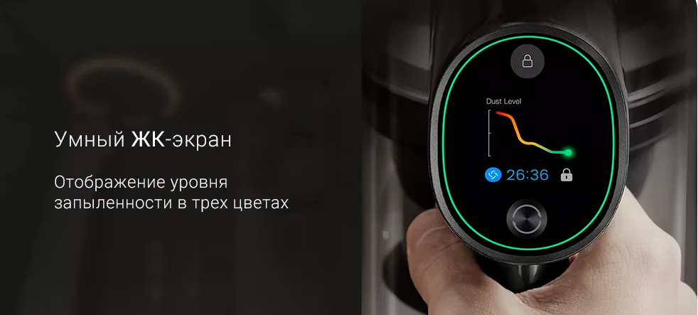 Пылесос оснащен умным ЖК-дисплеем, который показывает режим работы, состояние фильтров и оставшийся заряд аккумулятора. Главная особенность экрана – отображение уровня запыленности в трех цветах: красном, желтом и зеленом. Благодаря этому пользователю будет наглядно видна степень загрязнения.