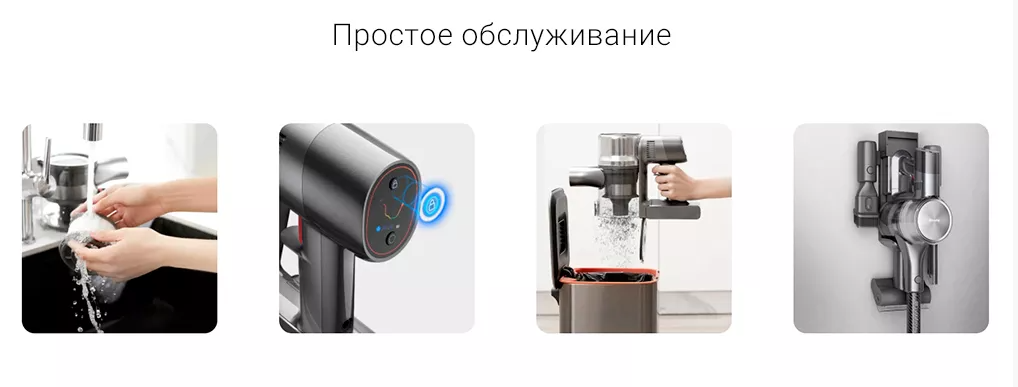 Пылесос обладает разборной конструкцией. Его составные элементы (пылесборник, фильтры и так далее) можно помыть обычной водой. Режим блокировки позволяет девайсу работать непрерывно, а пользователю при этом не придется удерживать палец на кнопке. Пылесборник очищается одним нажатием кнопки: ваши руки останутся чистыми.