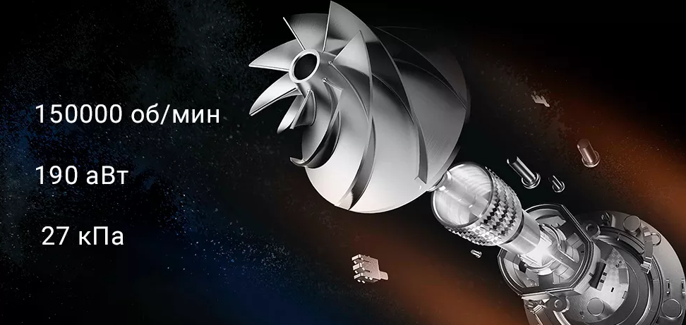 Гаджет использует двигатель с частотой вращения 150000 об/мин. Продуманный механизм работы обеспечивает удаление мусора и пыли за счет мощности всасывания в 190 аВт под давлением 27 кПа.