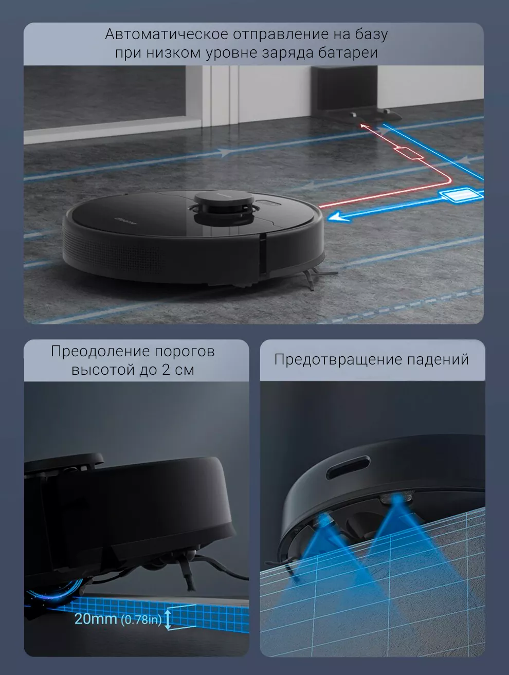 Если уровень заряда аккумулятора в Dreame D9 MAX будет слишком низок, то пылесос автоматически отправится на зарядную станцию. Позже он начнет уборку с того места, где она была приостановлена.