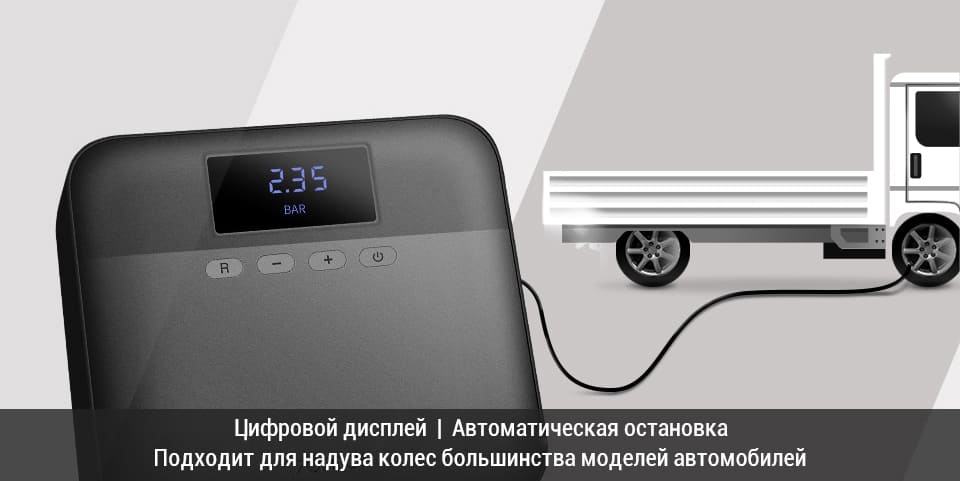 Компрессор Xiaomi 70mai Air Compressor Lite оснащён сенсорным дисплеем с возможностью автоматической остановки после заданного значения давления в шинах, а также функцией памяти.