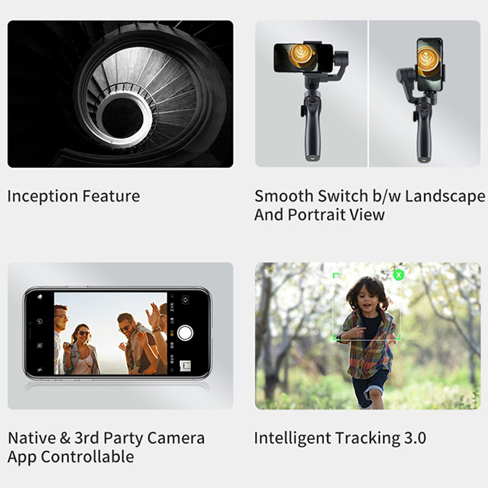 Стабилизатор поддерживает большинство популярных режимов, включая вращение на 360° («бочка»), «гипер-лапс» (интервальная съемка в движении), панорамную съемку и фокусировку по лицам. Режим PhoneGo обеспечивает повышенную скорость реакции для съемки экшн-сцен.