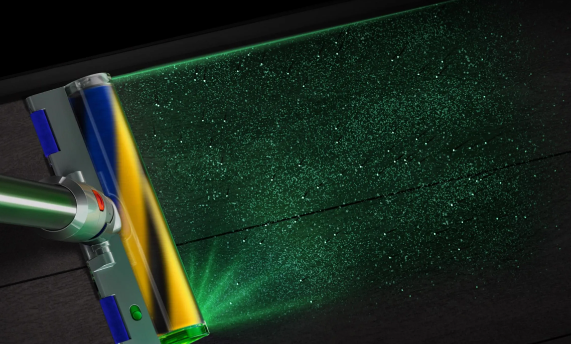 Зеленый лазерный луч подсвечивает грязь и пыль на поверхности.