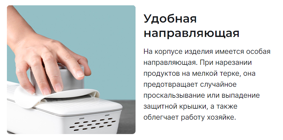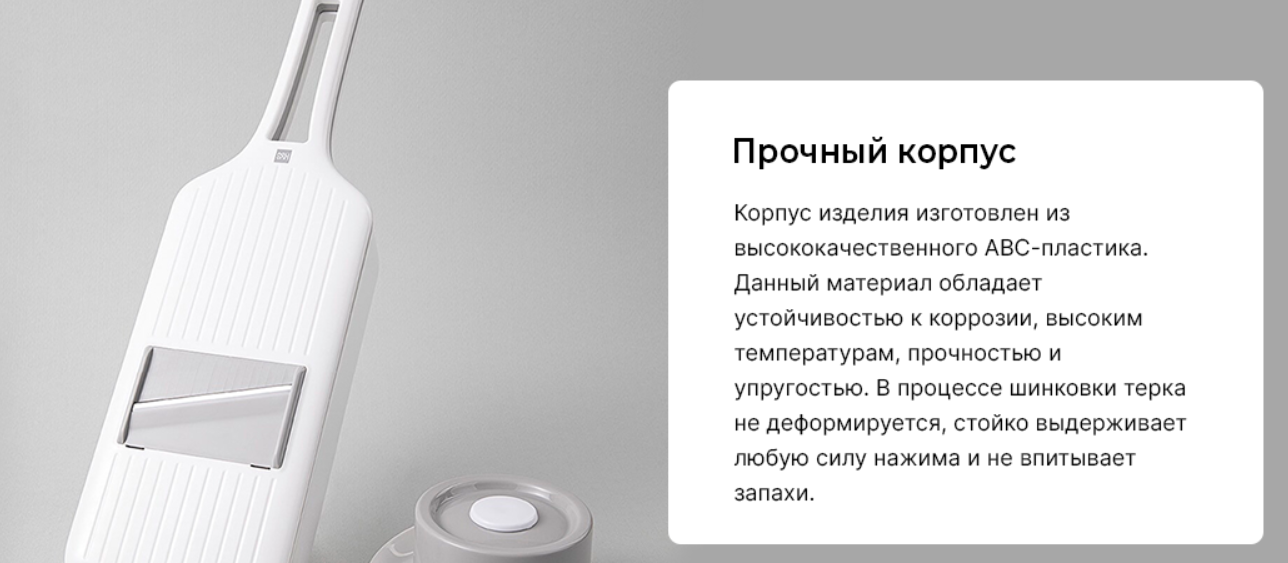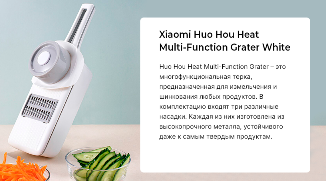 многофункциональная терка с тремя насадками, которые позволяют нарезать самые разнообразные продукты соломкой или ломтиками для разных блюд, не теряя времени на обычное орудование ножом. На одной из стенок контейнера для продуктов предусмотрены отверстия для слива жидкости, позволяющие прямо в нем промыть продукты водой, не доставая дополнительной посуды. На обратной стороне самой терки предусмотрены удобные выемки с захватами для хранения насадок. Теперь нужный инструмент для работы будет всегда под рукой, а не в коробке где-нибудь в шкафчике. Терка полностью разбирается для самой тщательной очистки и промывки под прямой струей воды. Корпус многофункциональной терки Huohou выполнен из высокопрочного АБС-пластика, который обладает множеством достоинств - он не боится коррозии и высокой температуры, благодаря собственной упругости он не деформируется, выдерживая высокие нагрузки, а также он не впитывает запахи.