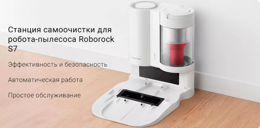 Как только робот-пылесос заканчивает уборку, он отправляется на зарядную станцию, где его пылесборник автоматически очищается от мусора. Благодаря этому обслуживание Roborock S7 сводится к минимуму.