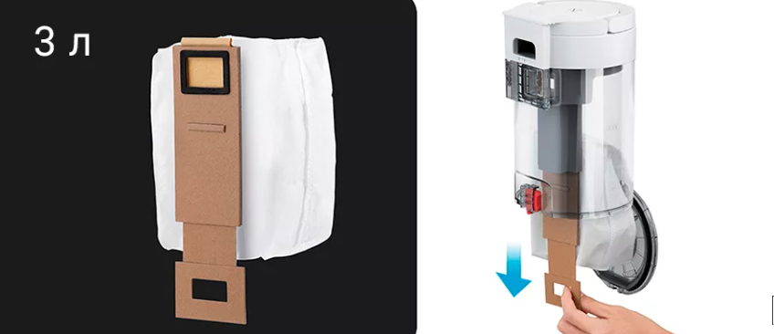 Внутри станции самоочистки устанавливается мешок для мусора объемом 3 л. При необходимости его легко заменить. Одного мешка хватает примерно на 6 недель.