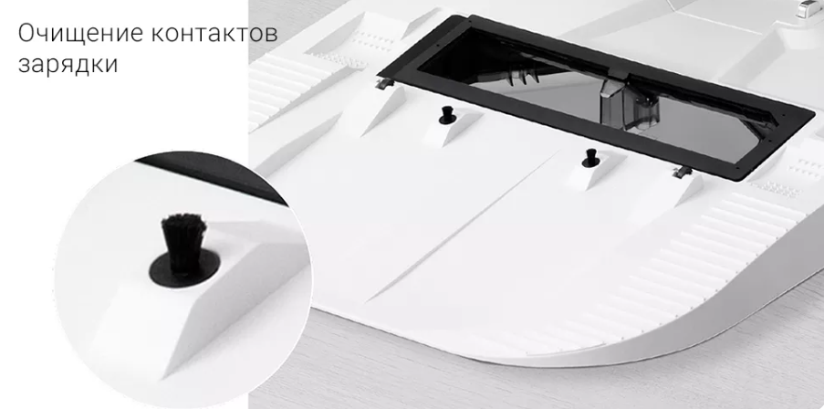 В основание док-станции встроены специальные щетки, которые очищают контакты зарядки перед состыковкой с пылесосом