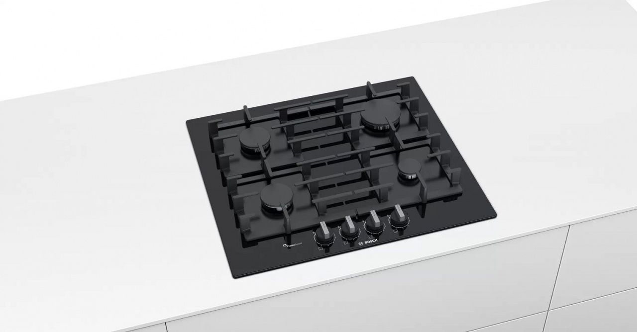 Газовая варочная поверхность Bosch PPP 6A6B90 обладает незаменимой функцией электророзжига, активация которого происходит при повороте специальных переключателей. Еще одно достоинство этой домашней помощницы – реализованная в ней функция газ-контроля, которая блокирует подачу голубого топлива при внезапном угасании одной из конфорок.