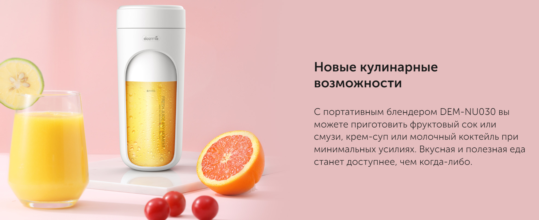 Легкий вес (440 г), компактный размер и наличие аккумулятора позволяют легко брать блендер с собой на пикник или в поход.