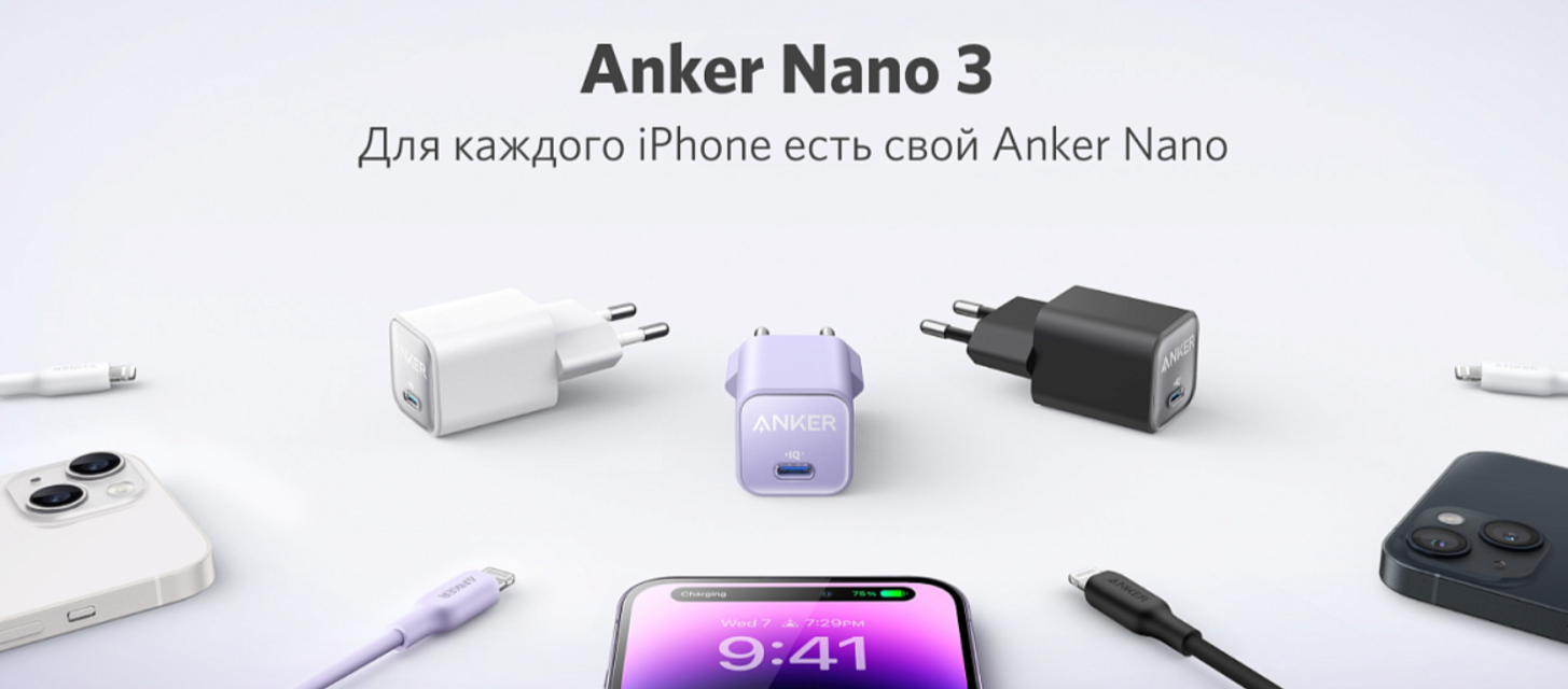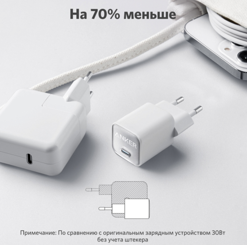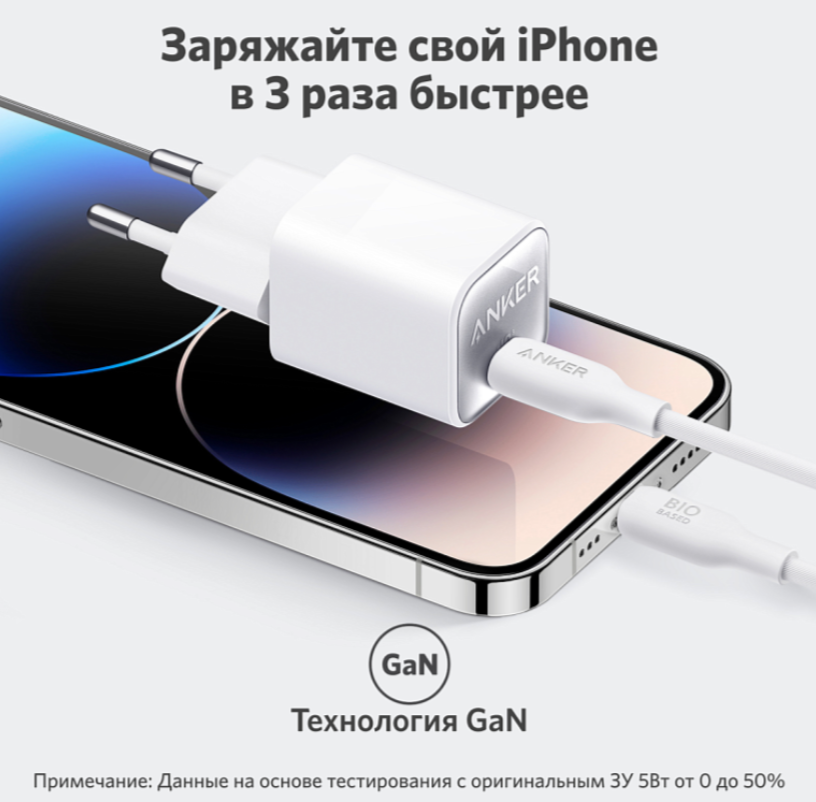 *Данные основаны на результатах внутреннего тестирования Anker Nano 3, проведенного в августе 2022 года в сравнении с оригинальным 30-ваттным зарядным устройством.