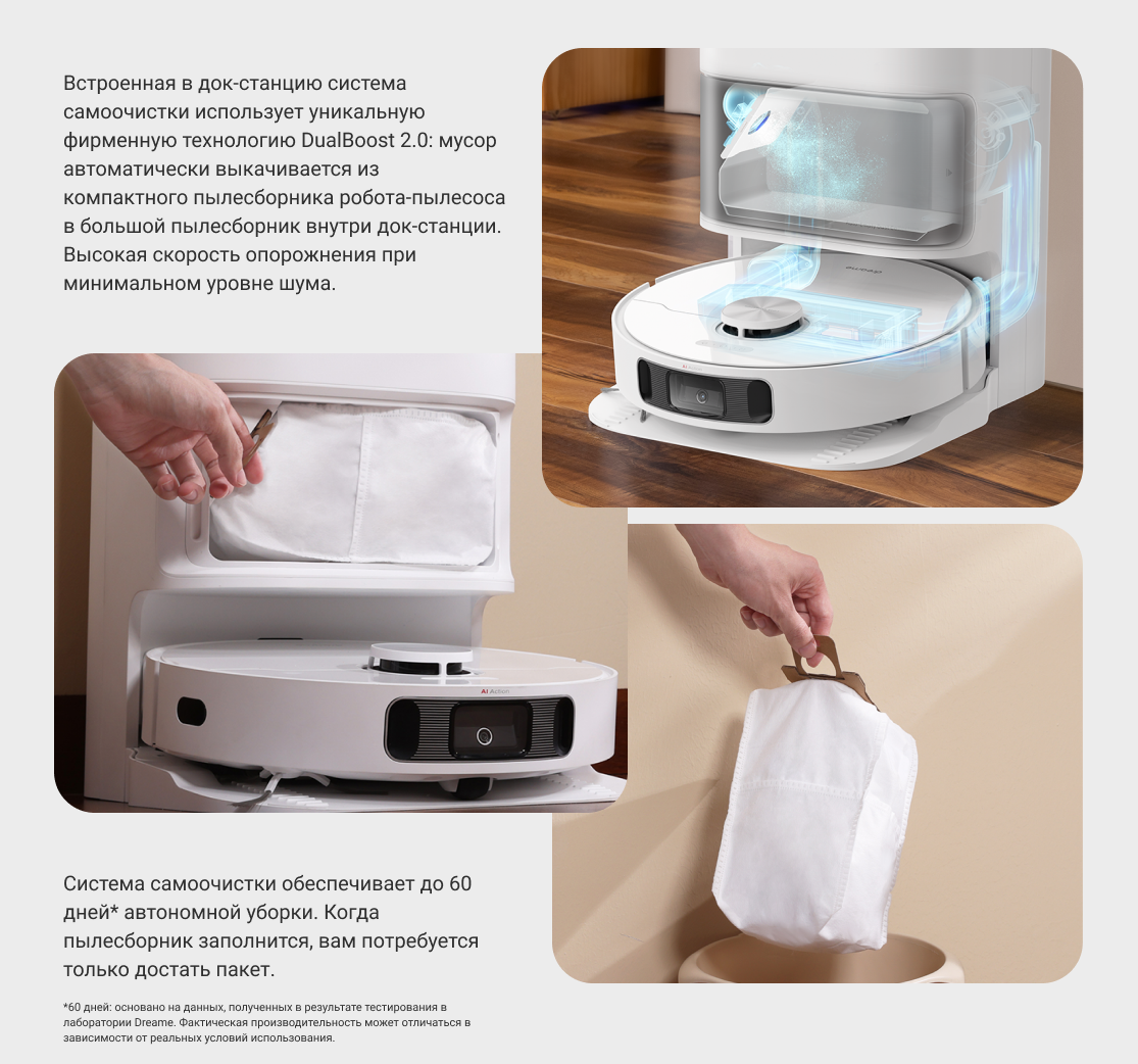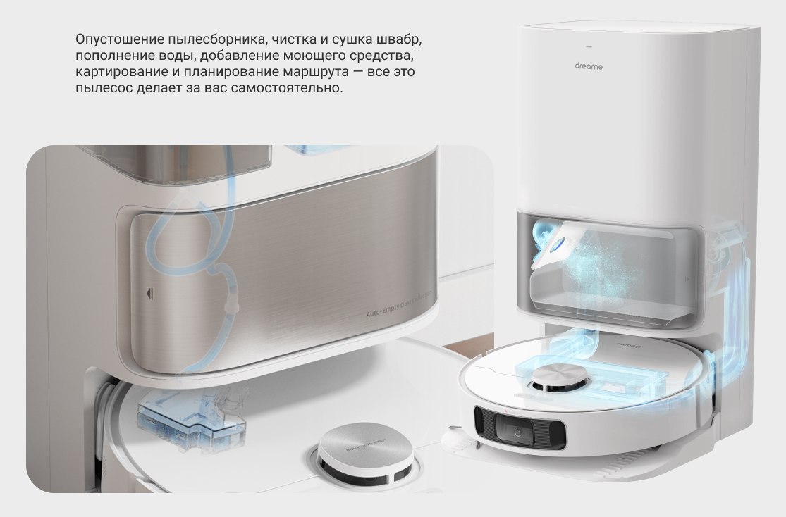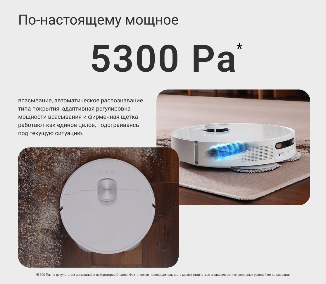 Функция самоочистки пылесборника, Автоматические чистка и сушка швабр, Интеллектуальная 3D навигация, Мощность всасывания 5,3 кПа, Функция подъема швабры |