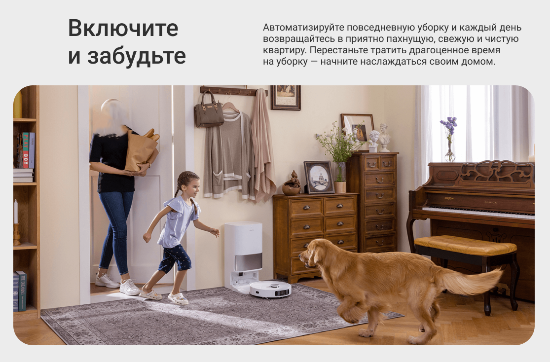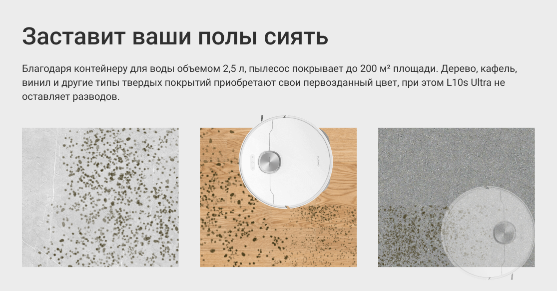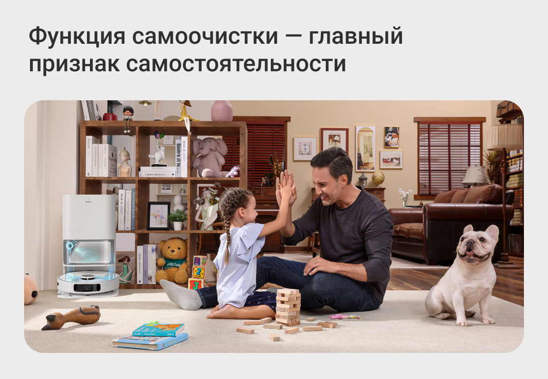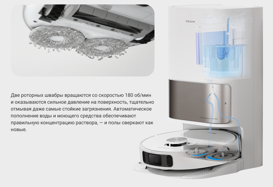 - Возвращаясь к станции, пылесос автоматически поднимает швабры, чтобы полы оставались чистыми.