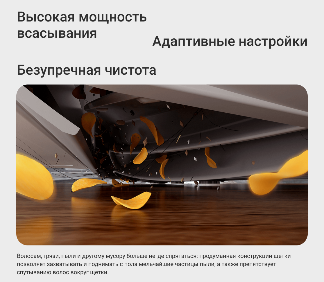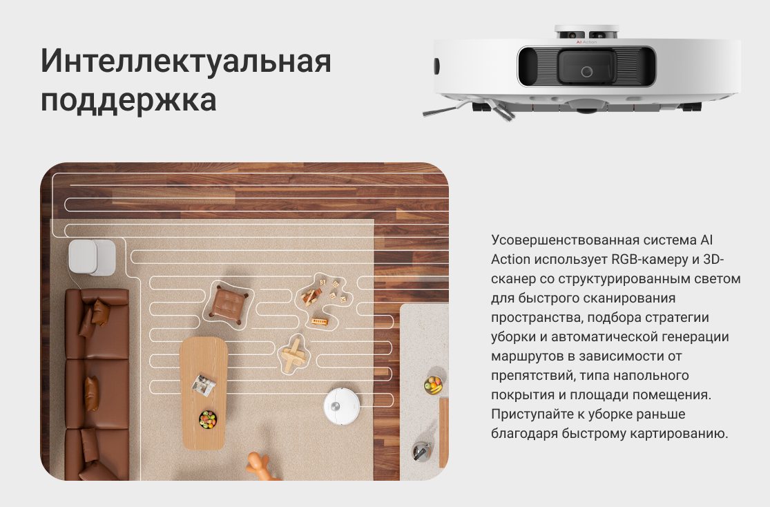 Интеллектуальная навигация гарантирует высокое качество уборки без слепых зон, позволяет пылесосу не сбиваться с маршрута и не застревать на стыках покрытий, а также минимизирует необходимость повторной уборки.