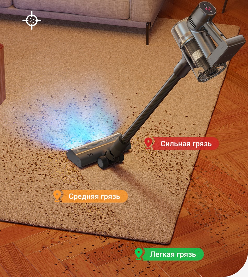 Пылесос Dreame R20 определяет уровень запыленности и автоматически регулирует мощность всасывания, чтобы выполнить уборку эффективнее.
