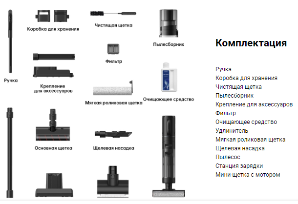 | Тип щетки | Мягкая роликовая щетка, Щелевая насадка, Мини-щетка с мотором |