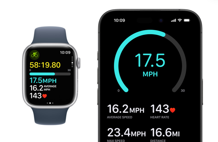 Запустите тренировку на велосипеде со своих часов, и она автоматически отобразится в режиме реального времени на вашем iPhone. Коснитесь ее, и она займет весь дисплей, что облегчит просмотр ваших показателей во время поездки.