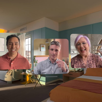 Apple Vision Pro выводит удобство использования видеовстреч через FaceTime на абсолютно новый уровень. Приложение показывает собеседников в реальную величину, и его видеопанели расширяются, когда к встрече присоединяются новые участники — все они будто находятся на расстоянии вытянутой руки.