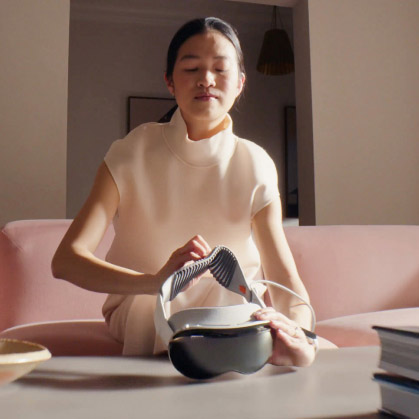 Пространственный компьютер использует пару дисплеев на базе технологии micro-OLED. Они передают глазу больше пикселей, чем телевизор с разрешением 4K. Благодаря уникальной конструкции Apple Vision Pro мягко прилегает к лицу, блокируя рассеянный свет — изображение удивляет невероятной чёткостью.