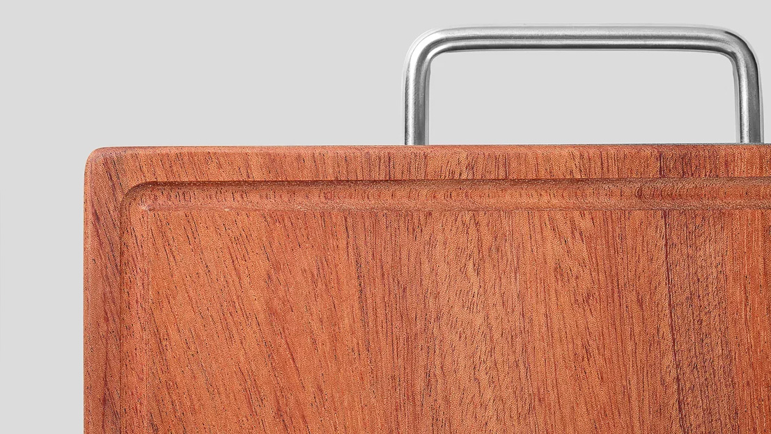 Выбранный материал (древесина сапеле) идеально подходит для разделочной доски, он прочный и надежный, сделан из цельного куска дерева, причем из каждого ствола можно изготовить лишь две разделочных доски, что делает задачу по производству оной еще более ответственной. Обе стороны доски годятся для использования, с одной из сторон есть канавка. Доска лишена трещин и зазоров, в которые могла бы попасть грязь. Соответственно, ее легко мыть, и она безопасна для здоровья. Для долговечности доска покрыта органическим защитным маслом, дабы грязь не могла попасть в поры, присутствующие в любой древесине.