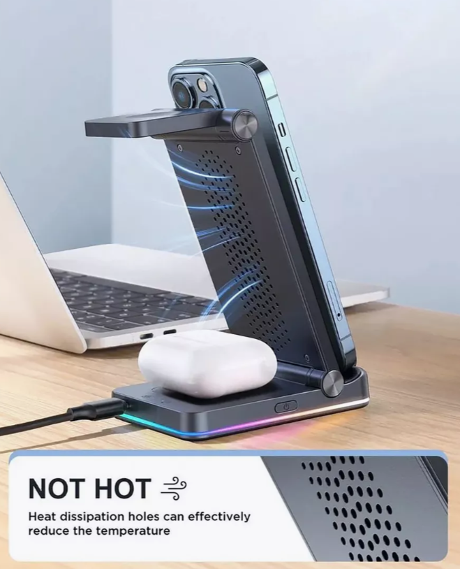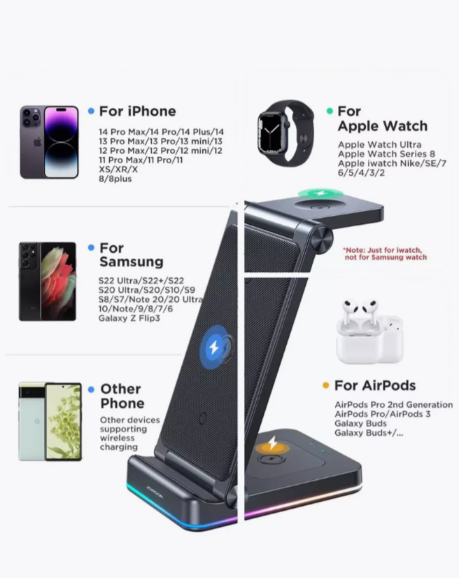 Он может обеспечить большую выходную мощность 15 вт для мобильных телефонов, выходную мощность 5 вт/3 вт для зарядки наушников (например, для apple airpods и samsung galaxy buds) и мощность зарядки на 2,5 вт для часов (только для apple watch)