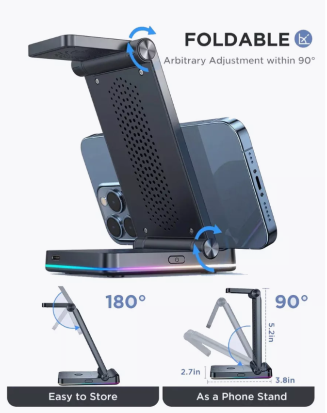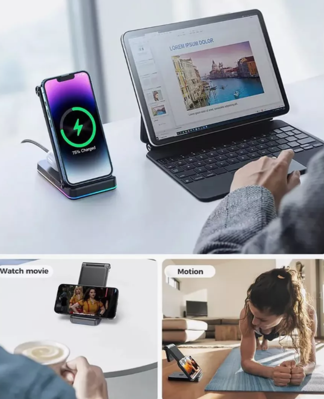 Складной дизайн, поместите свой телефон горизонтально, чтобы посмотреть фильм во время зарядки или вертикально для видеочата или распознавания лица.