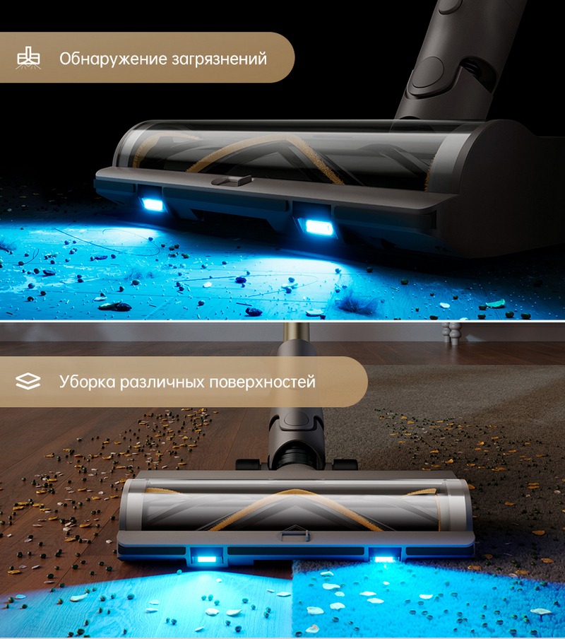 В комплекте насадок присутствует мини турбо-щетка с синей подсветкой. Она не только отлично собирает мусор и пылевых клещей с мягкой мебели, но и подсвечивает шерсть и перхоть от домашних животных.