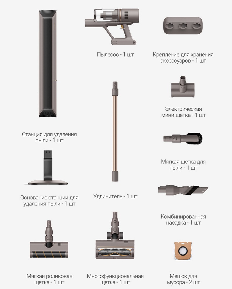 Пылесос, крепление для хранения аксессуаров, станция для удаления пыли, основание станции для удаления пыли, удлинитель, мешок для мусора 2 шт |