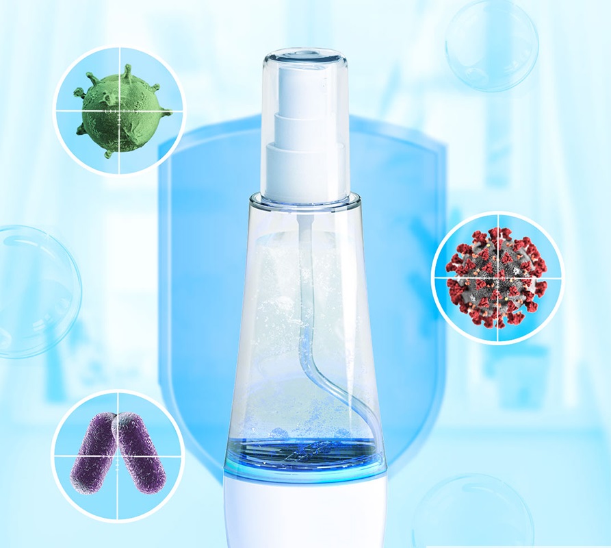 После процесса электролиза получившийся дезинфицирующий раствор можно распылить прямо из бутылки, благодаря удобному распылителю. Объёма хватит на 400 распылений.
